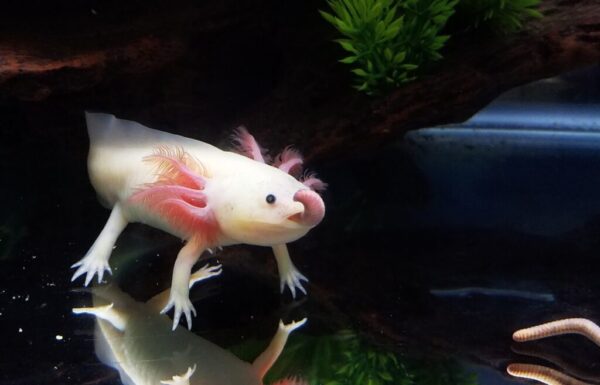 Axolotl bílý s růžovým nádechem a růžovými žábrami černýma očima. Podívejte se na obrázky. Zvykl na speciální suché krmivo pro axolotly a teplotu 20-23 stupňů.